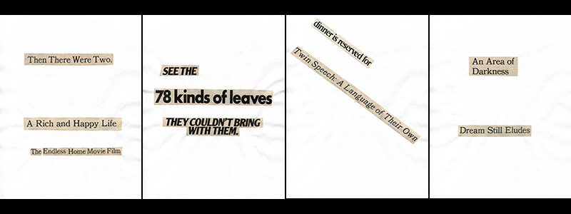 Cutting Out The New York Times is a series of 26 “cut-out” or “found” newspaper poems made by O’Grady on successive Sundays, from June 5 to November 20, 1977. They were first exhibited to the public at Daniel Reich Temp. at the Chelsea Hotel, in March 2006 at the urging of curator Nick Mauss. The slideshow here contains four of the poems in their entirety.