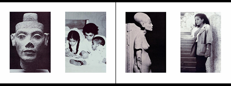 Finally forced to place her declining parent in a nursing home, O’Grady resumed activity in 1988 when she received an invitation to participate in the exhibition Art As A Verb. For that show, she had eight slides from Nefertiti/Devonia Evangeline made into four Cibachrome diptychs. The new work, called simply Sisters I, II, III, IV, juxtaposed images of her sister (Devonia Evangeline) and the Ancient Egyptian queen, Nefertiti, with images of herself and Nefertiti’s younger sister, Mutnedjmet, followed by images of Devonia Evangeline’s two daughters with images of Nefertiti’s daughters. Stripped of the tragic details of the earlier work, the new piece zeroed in on Black female family ties, an ancestral legacy that includes the civilizations of the Nile Valley, and the “mulatto” cultures of both ancient Egypt and contemporary America. The following spring, O’Grady gave one last performance of the original Nefertiti/Devonia Evangeline at the Maryland Art Institute in Baltimore.
