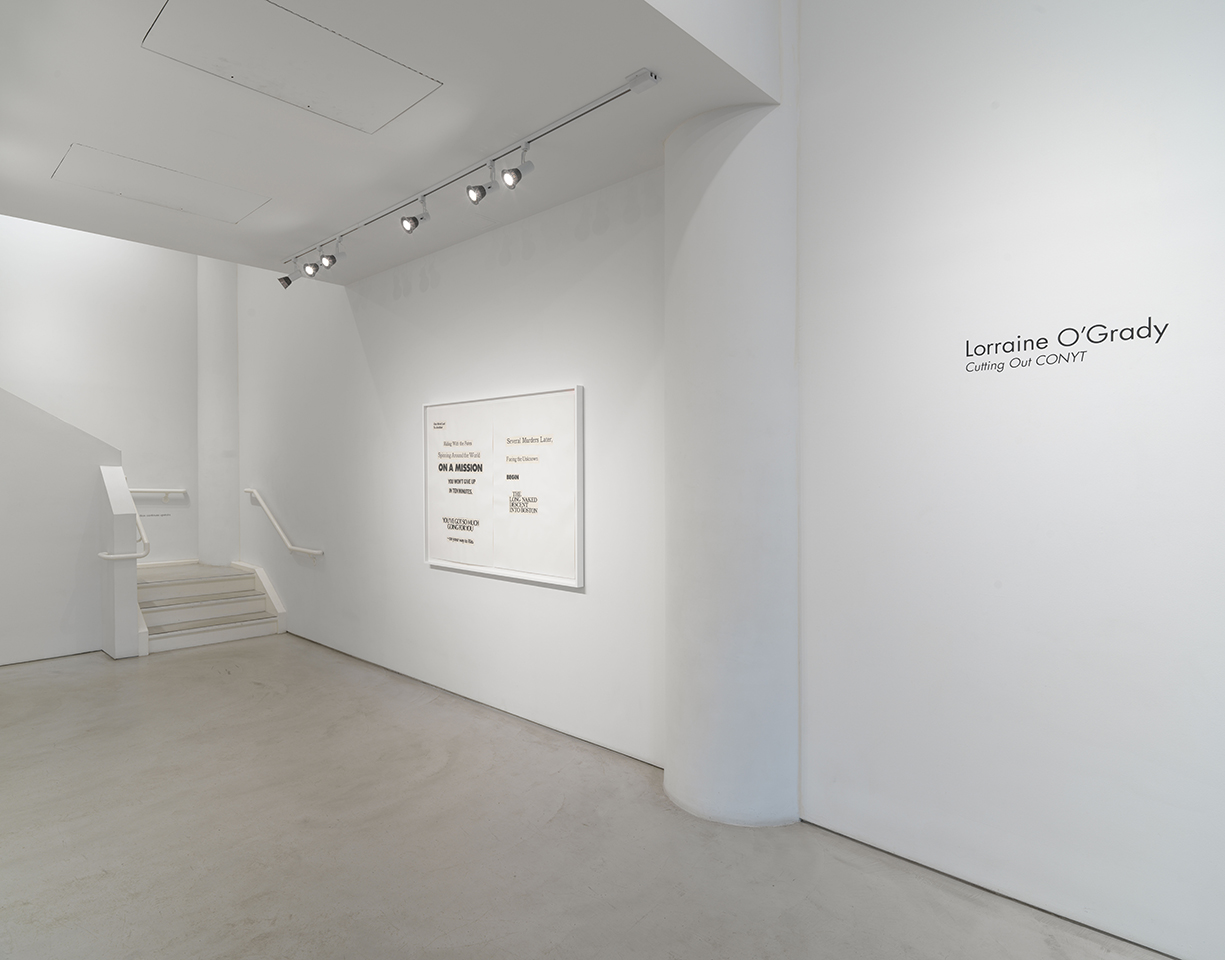 - Alexander Gray, Chelsea, 2018 gallery exhibit – “Lorraine O’Grady: Cutting Out CONYT.” View of Cutting Out CONYT, 1977/2017. Diptych prints, letterpress on Japanese paper, cut out and collaged on laid paper. Framed size: 63.25w x 45.25h x2d (in) each. Installation shot courtesy Alexander Gray Associates, NY.