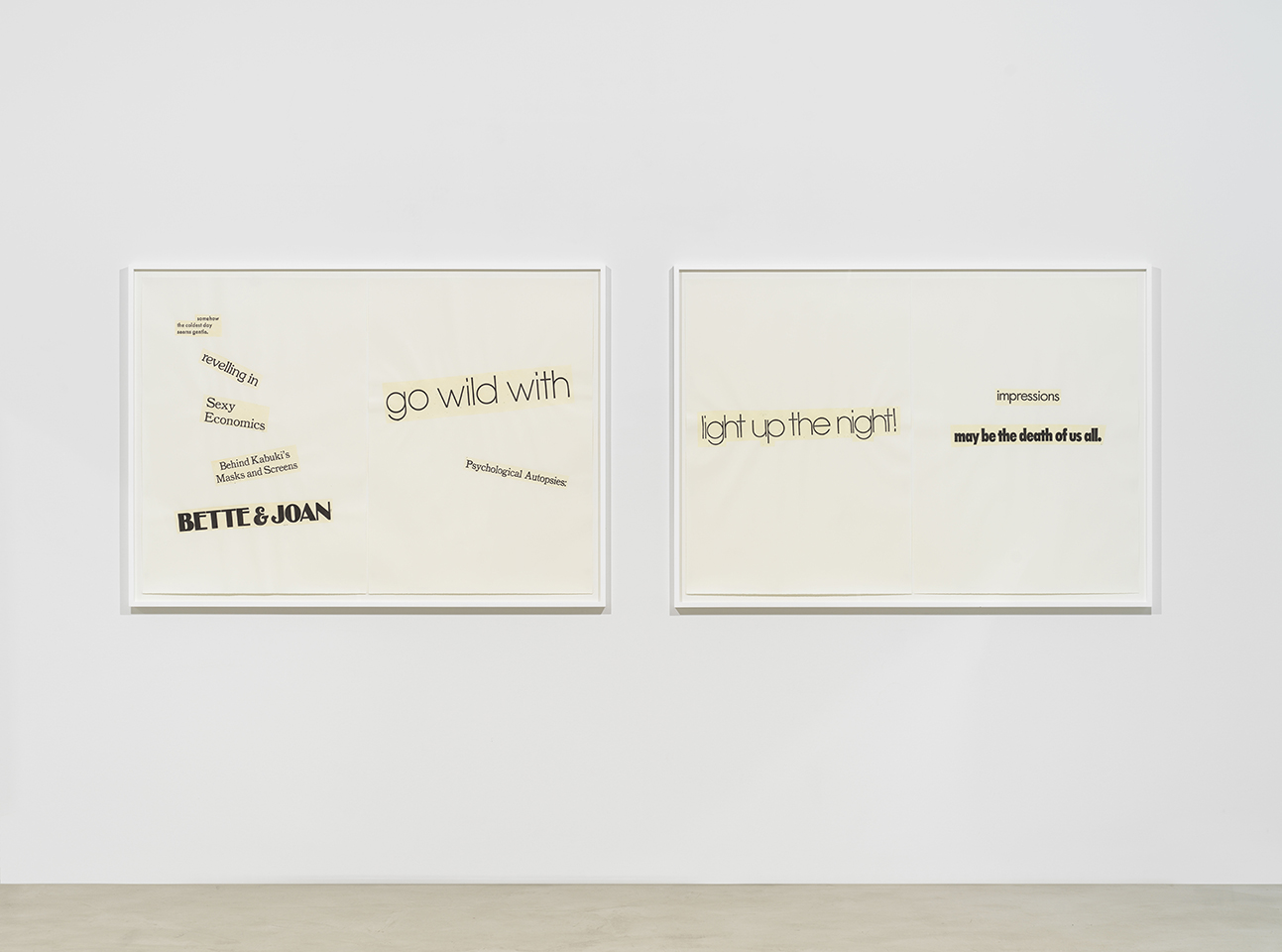 - Haiku Diptych 14. Studio sketch. Two panels selected from Cutting Out the New York Times (CONYT), 1977, as model for new diptych in Cutting Out CONYT, 1977/2017. Original newsprint cut-outs collaged on rag bond paper, each panel 8.5w x 11h (in). Sketch courtesy Lorraine O’Grady Studio.