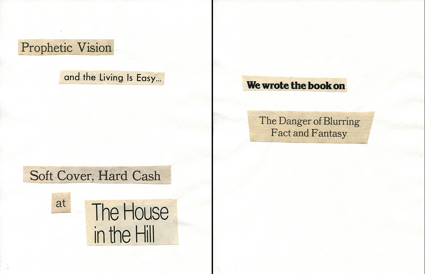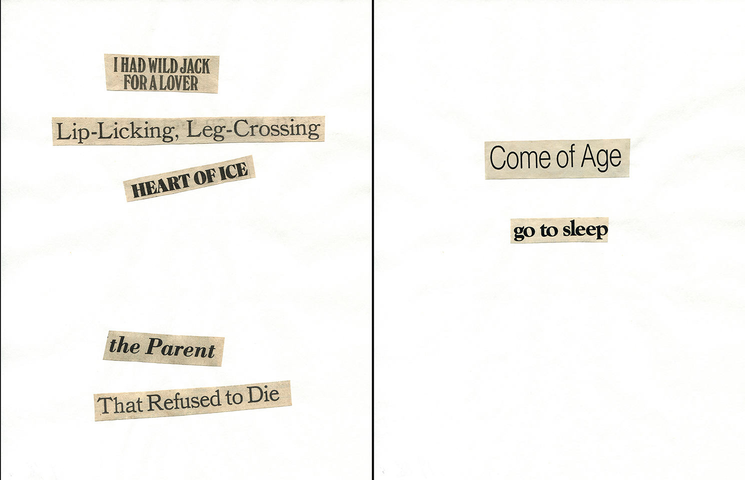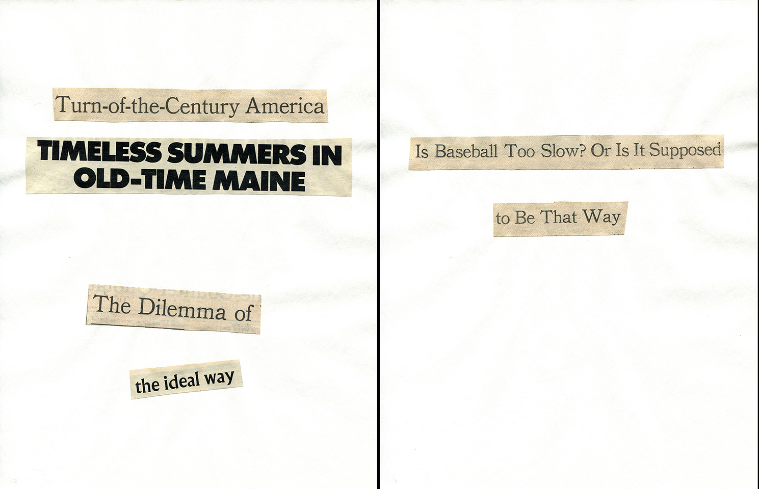 - Haiku Diptych 21. Studio sketch. Two panels selected from Cutting Out the New York Times (CONYT), 1977, as model for new diptych in Cutting Out CONYT, 1977/2017. Original newsprint cut-outs collaged on rag bond paper, each panel 8.5w x 11h (in). Sketch courtesy Lorraine O’Grady Studio.