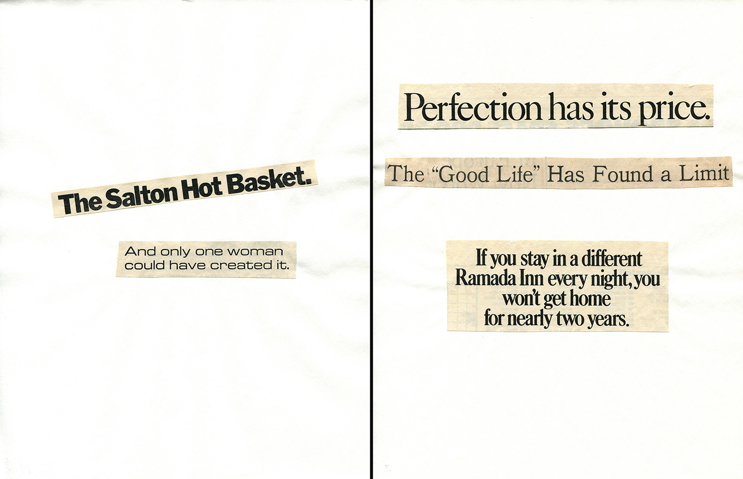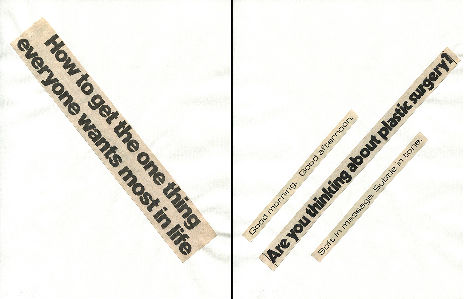 - Haiku Diptych 7. Studio sketch. Two panels selected from Cutting Out the New York Times (CONYT), 1977, as model for new diptych in Cutting Out CONYT, 1977/2017. Original newsprint cut-outs collaged on rag bond paper, each panel 8.5w x 11h (in). Sketch courtesy Lorraine O’Grady Studio.