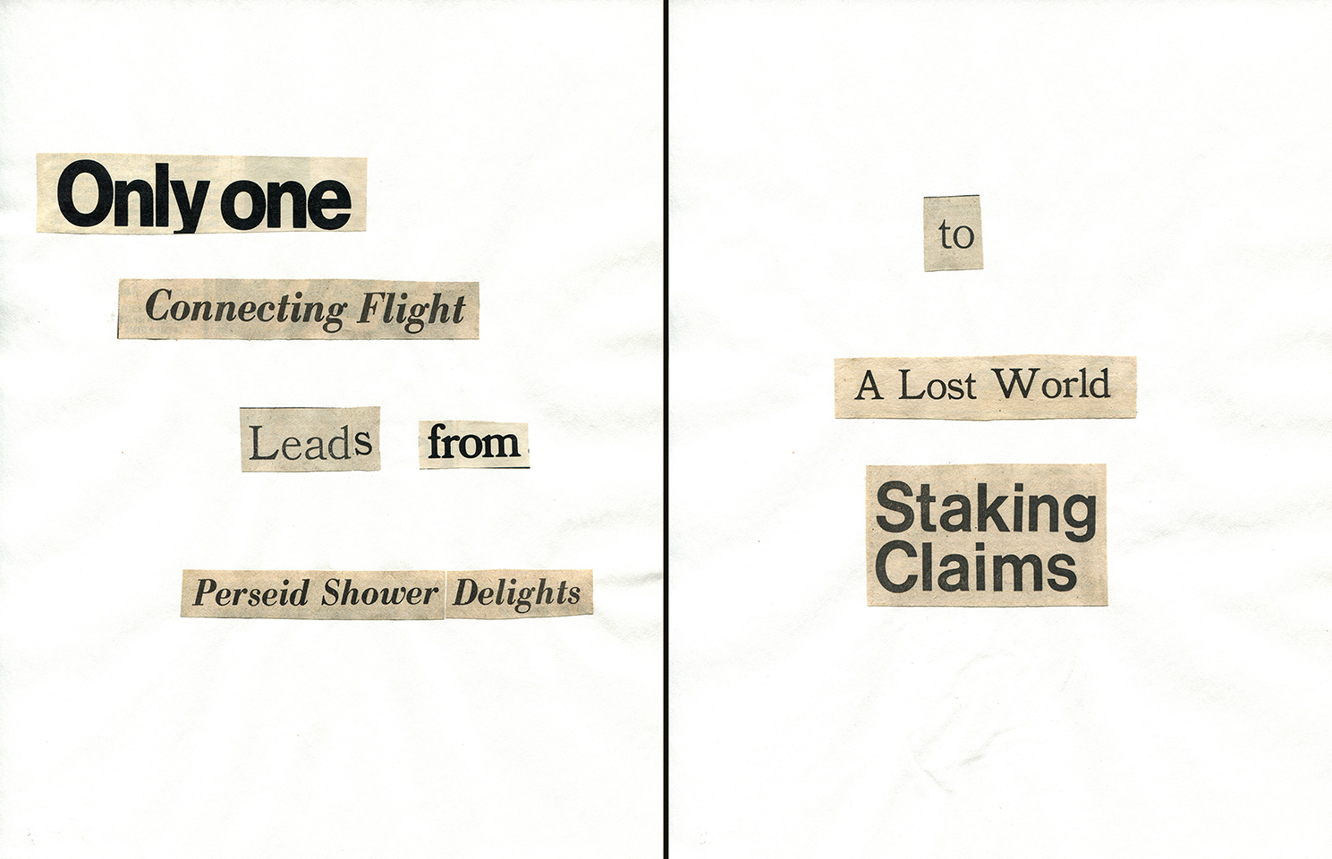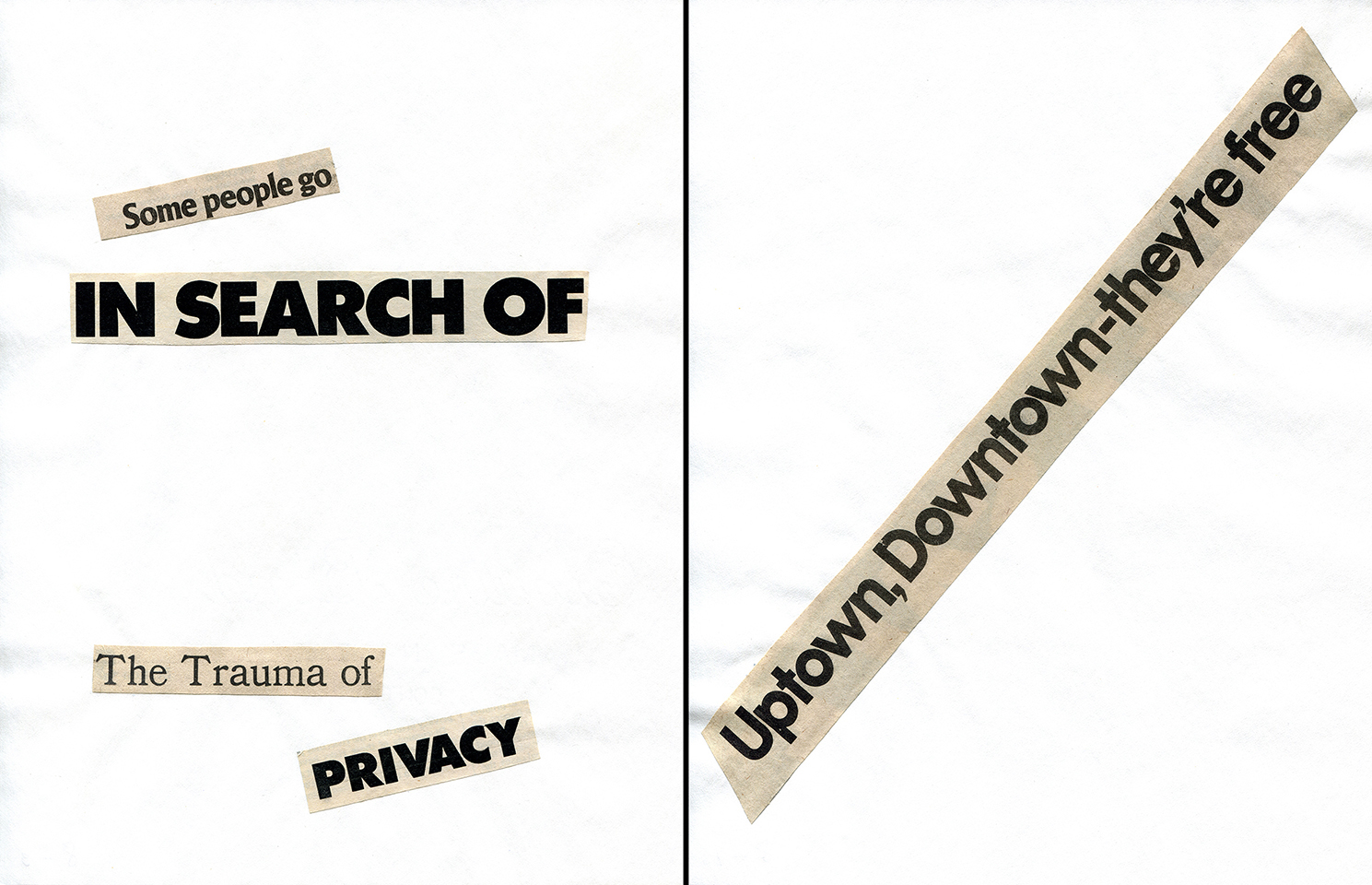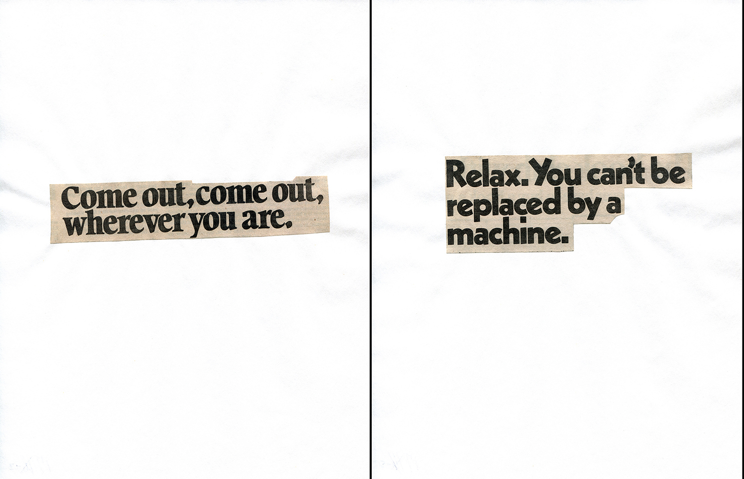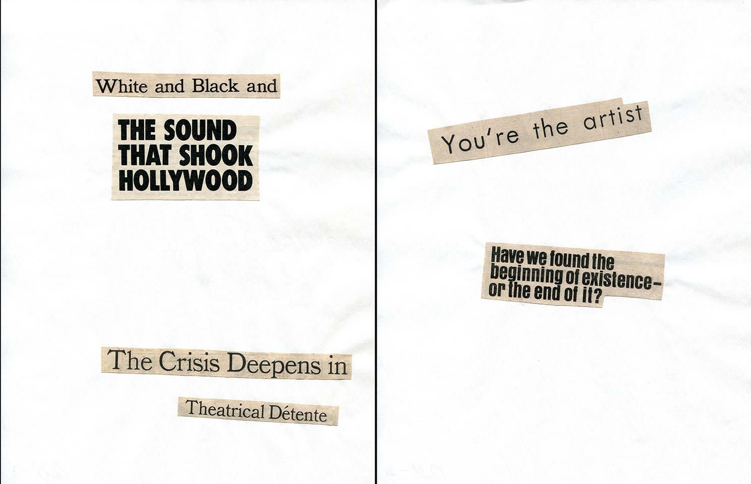 - Haiku Diptych 2. Studio sketch. Two panels selected from Cutting Out the New York Times (CONYT), 1977, as model for new diptych in Cutting Out CONYT, 1977/2017. Original newsprint cut-outs collaged on rag bond paper, each panel 8.5w x 11h (in). Sketch courtesy Lorraine O’Grady Studio.