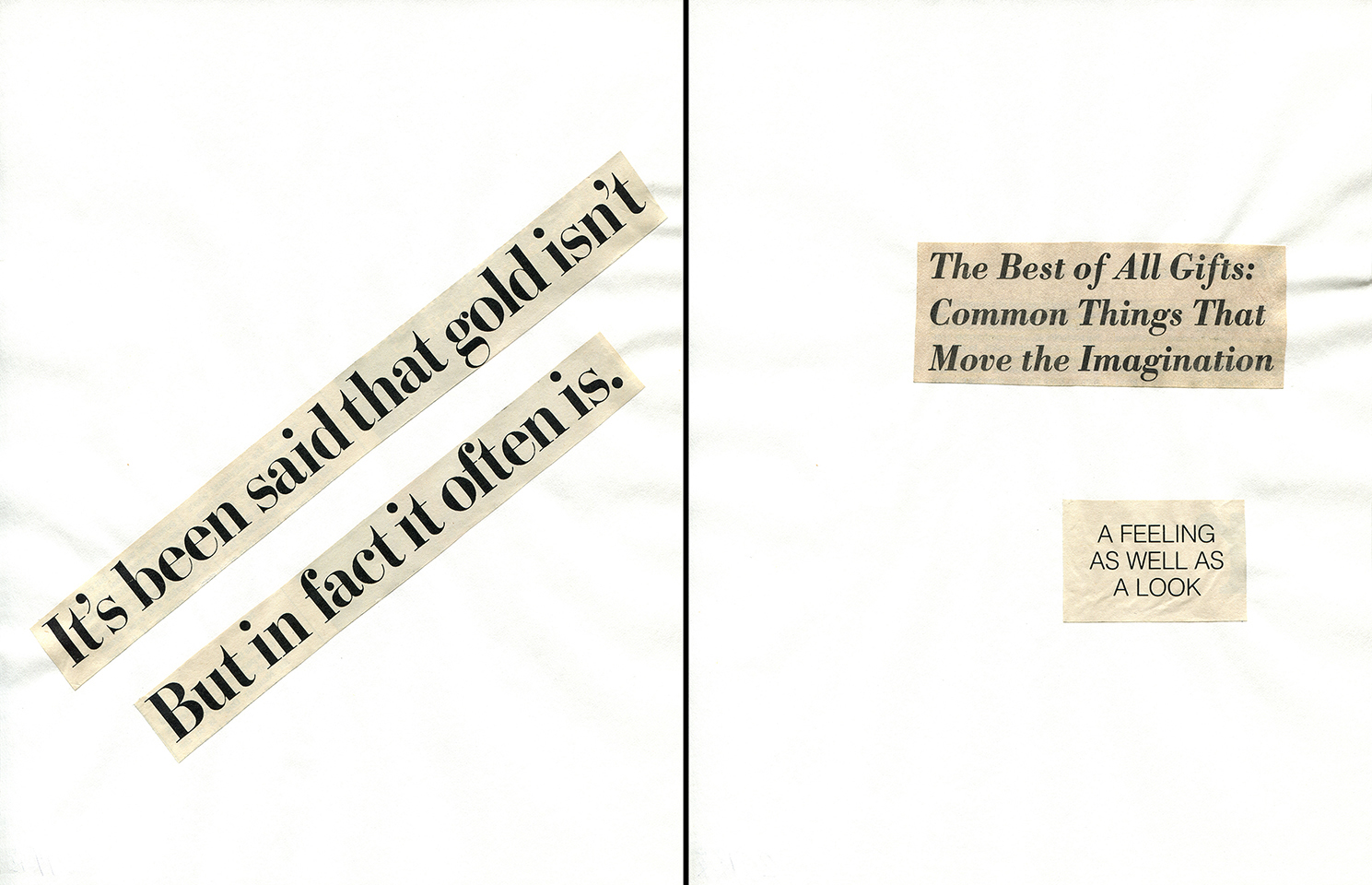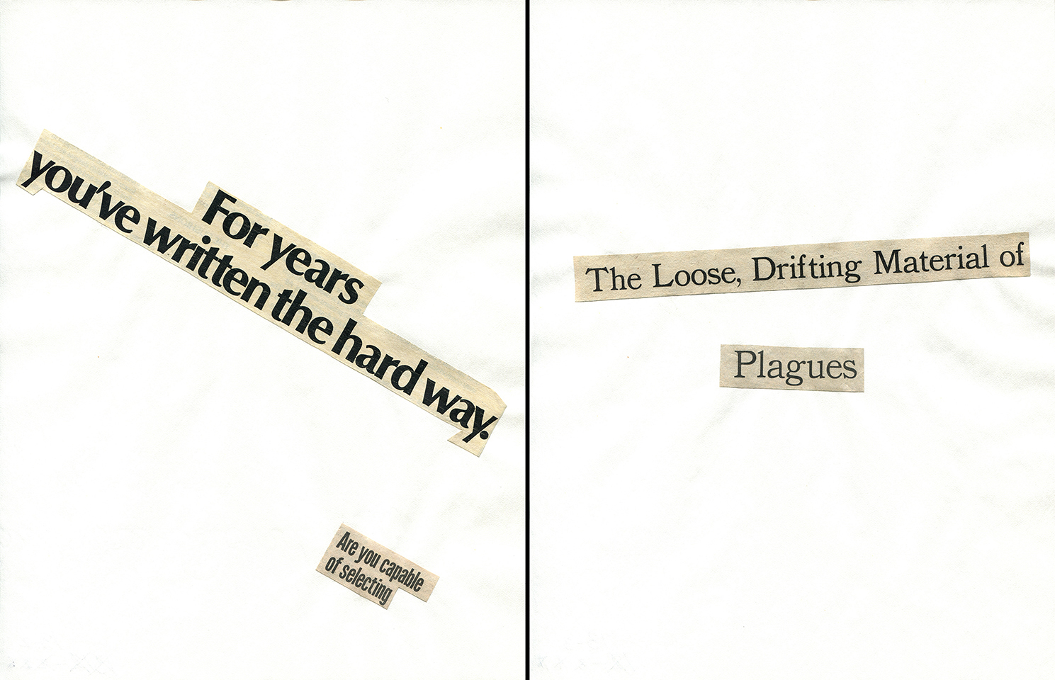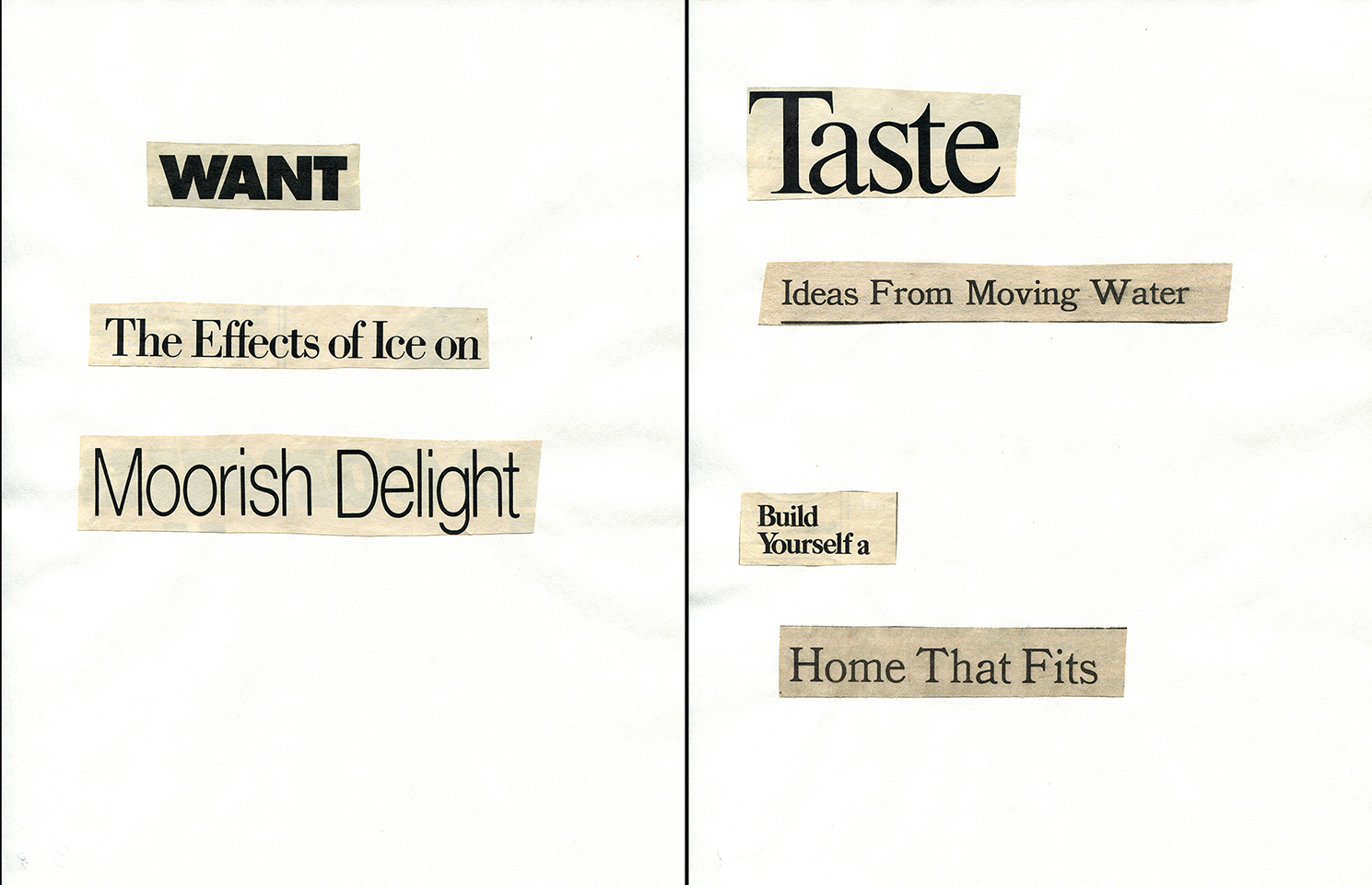 - Haiku Diptych 2. Studio sketch. Two panels selected from Cutting Out the New York Times (CONYT), 1977, as model for new diptych in Cutting Out CONYT, 1977/2017. Original newsprint cut-outs collaged on rag bond paper, each panel 8.5w x 11h (in). Sketch courtesy Lorraine O’Grady Studio.