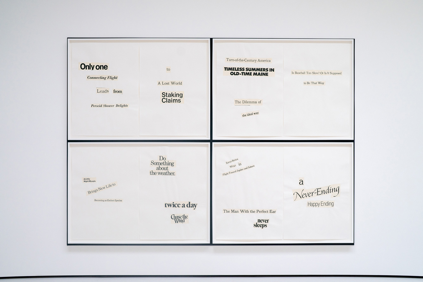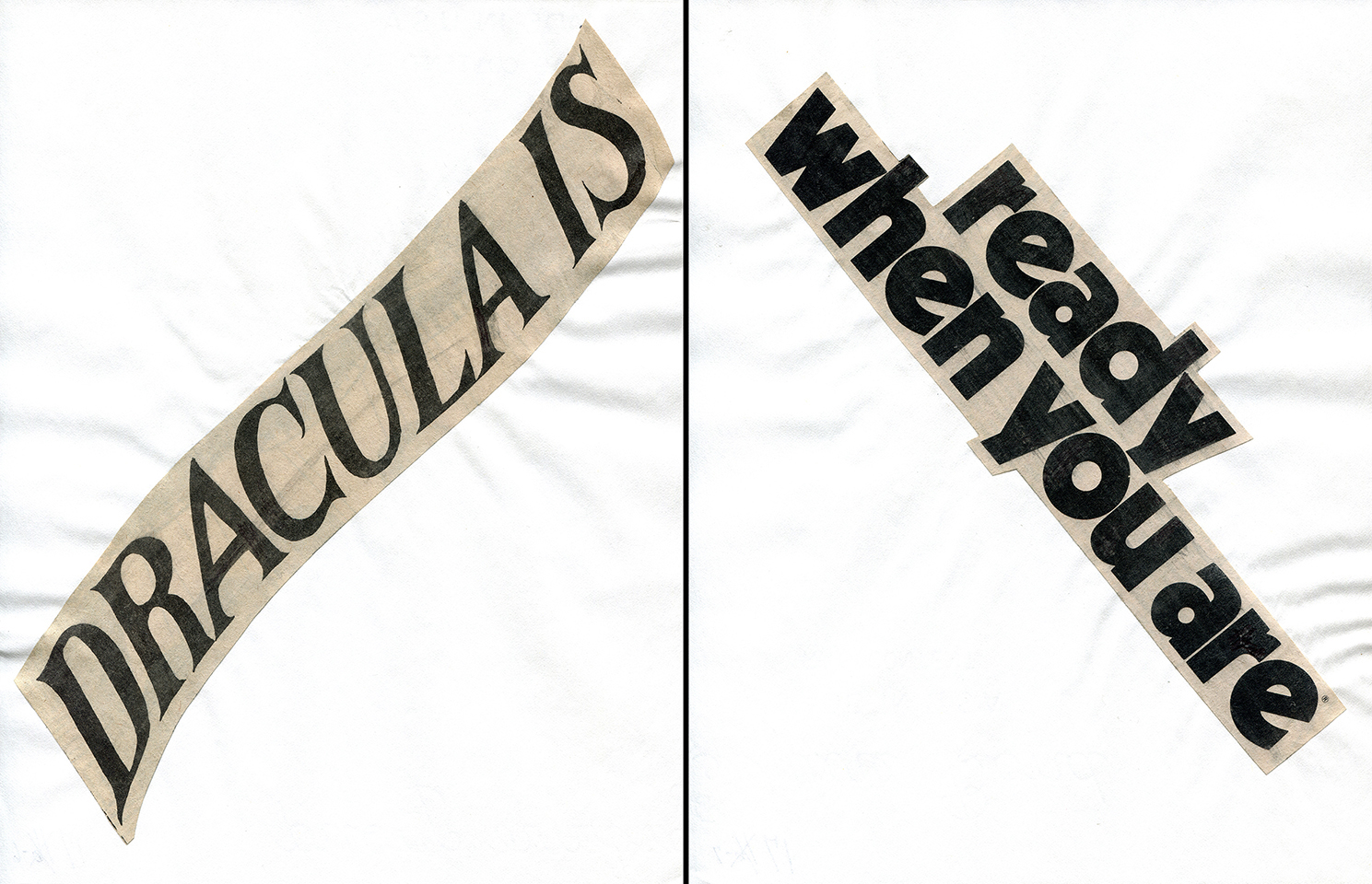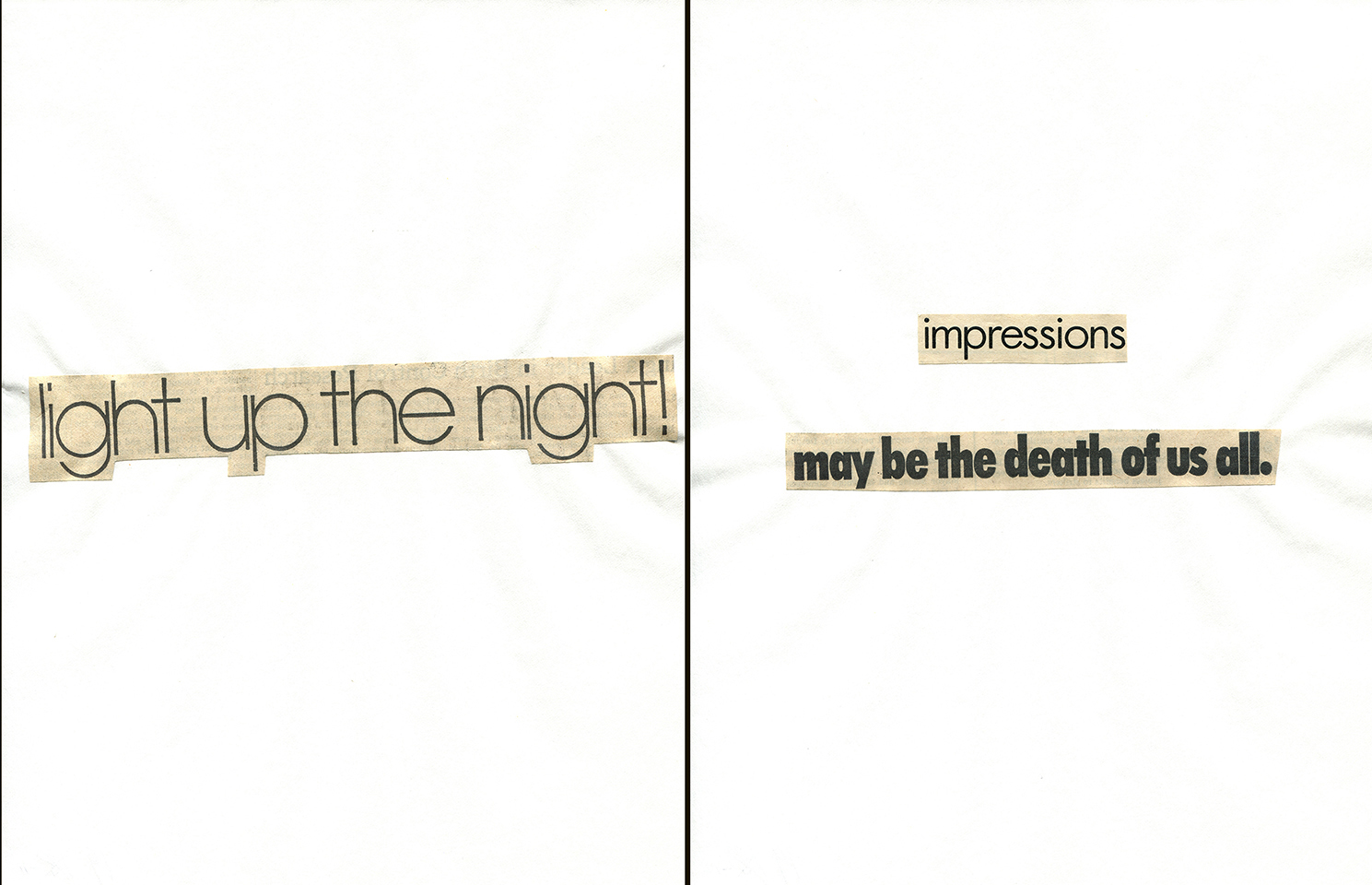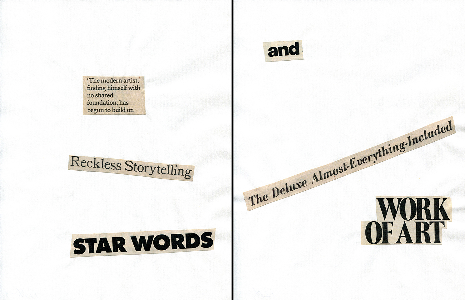 - Haiku Diptych 2. Studio sketch. Two panels selected from Cutting Out the New York Times (CONYT), 1977, as model for new diptych in Cutting Out CONYT, 1977/2017. Original newsprint cut-outs collaged on rag bond paper, each panel 8.5w x 11h (in). Sketch courtesy Lorraine O’Grady Studio.