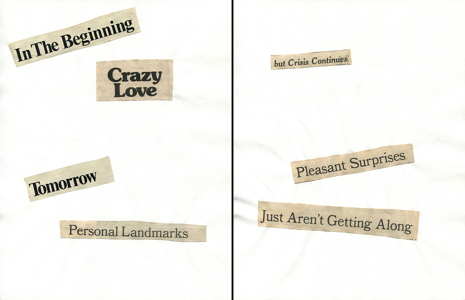 - Haiku Diptych 16. Studio sketch. Two panels selected from Cutting Out the New York Times (CONYT), 1977, as model for new diptych in Cutting Out CONYT, 1977/2017. Original newsprint cut-outs collaged on rag bond paper, each panel 8.5w x 11h (in). Sketch courtesy Lorraine O’Grady Studio.
