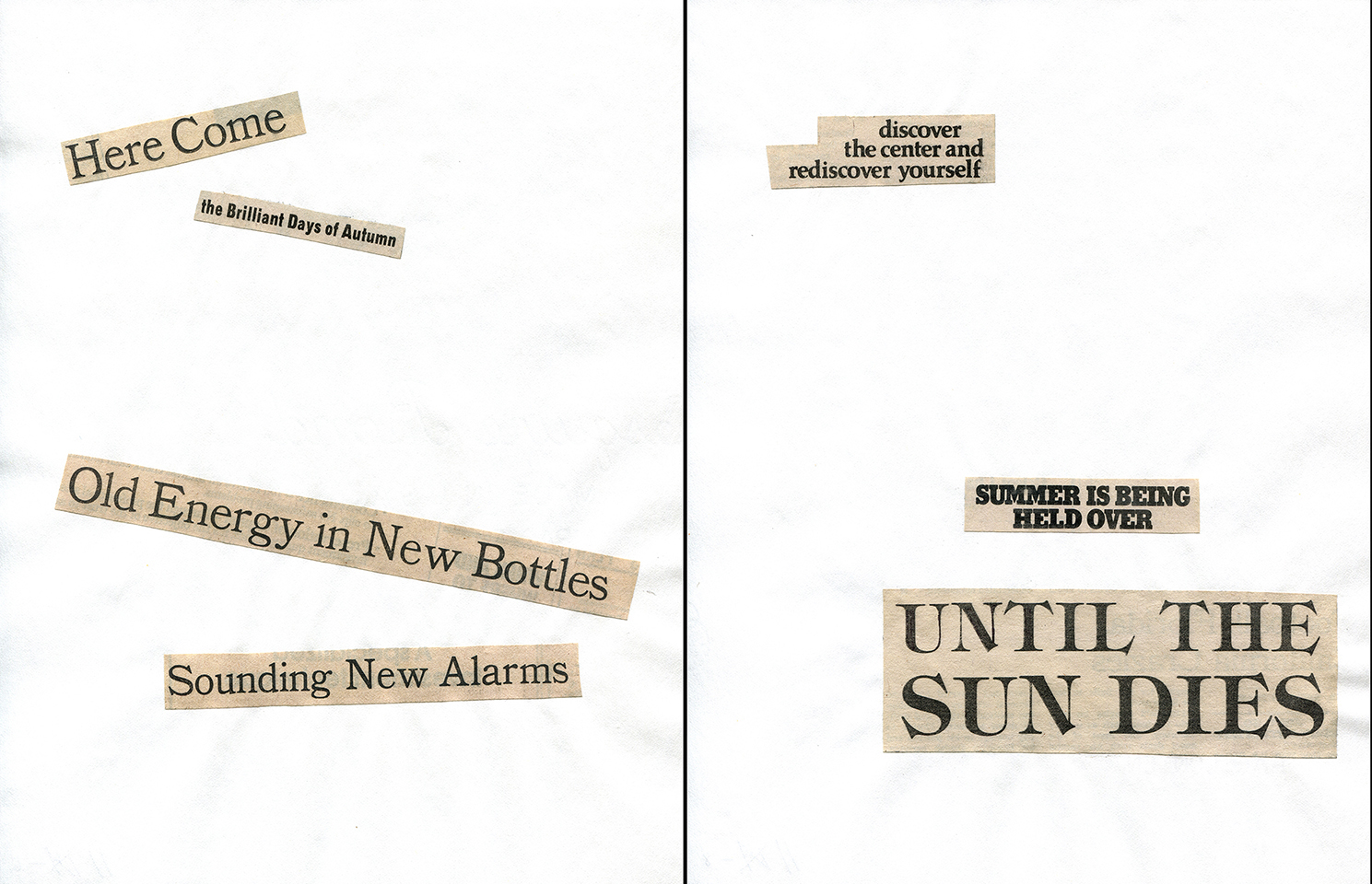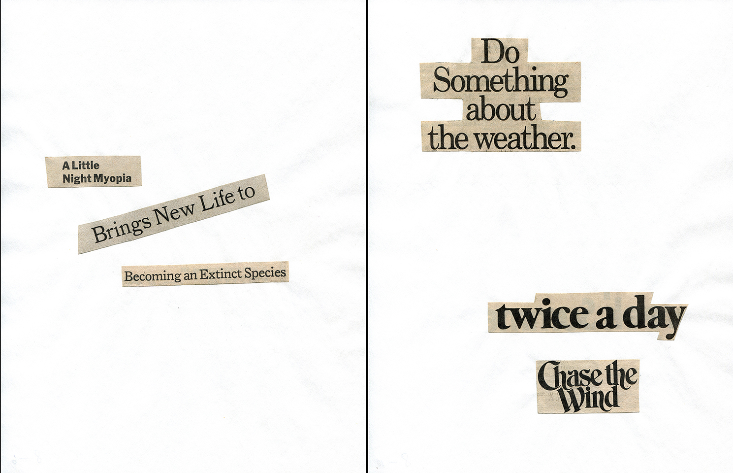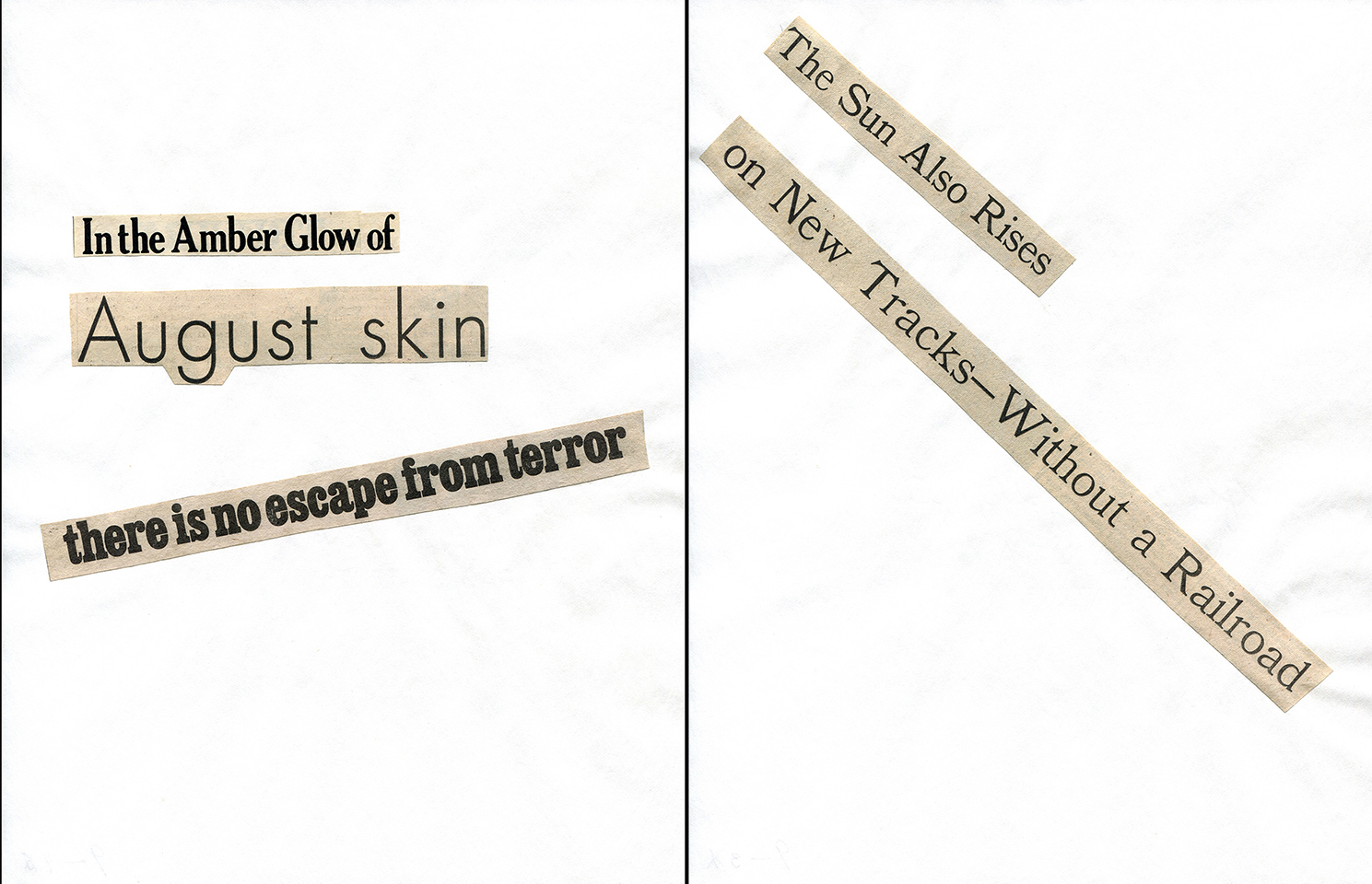 - Haiku Diptych 20. Studio sketch. Two panels selected from Cutting Out the New York Times (CONYT), 1977, as model for new diptych in Cutting Out CONYT, 1977/2017. Original newsprint cut-outs collaged on rag bond paper, each panel 8.5w x 11h (in). Sketch courtesy Lorraine O’Grady Studio.