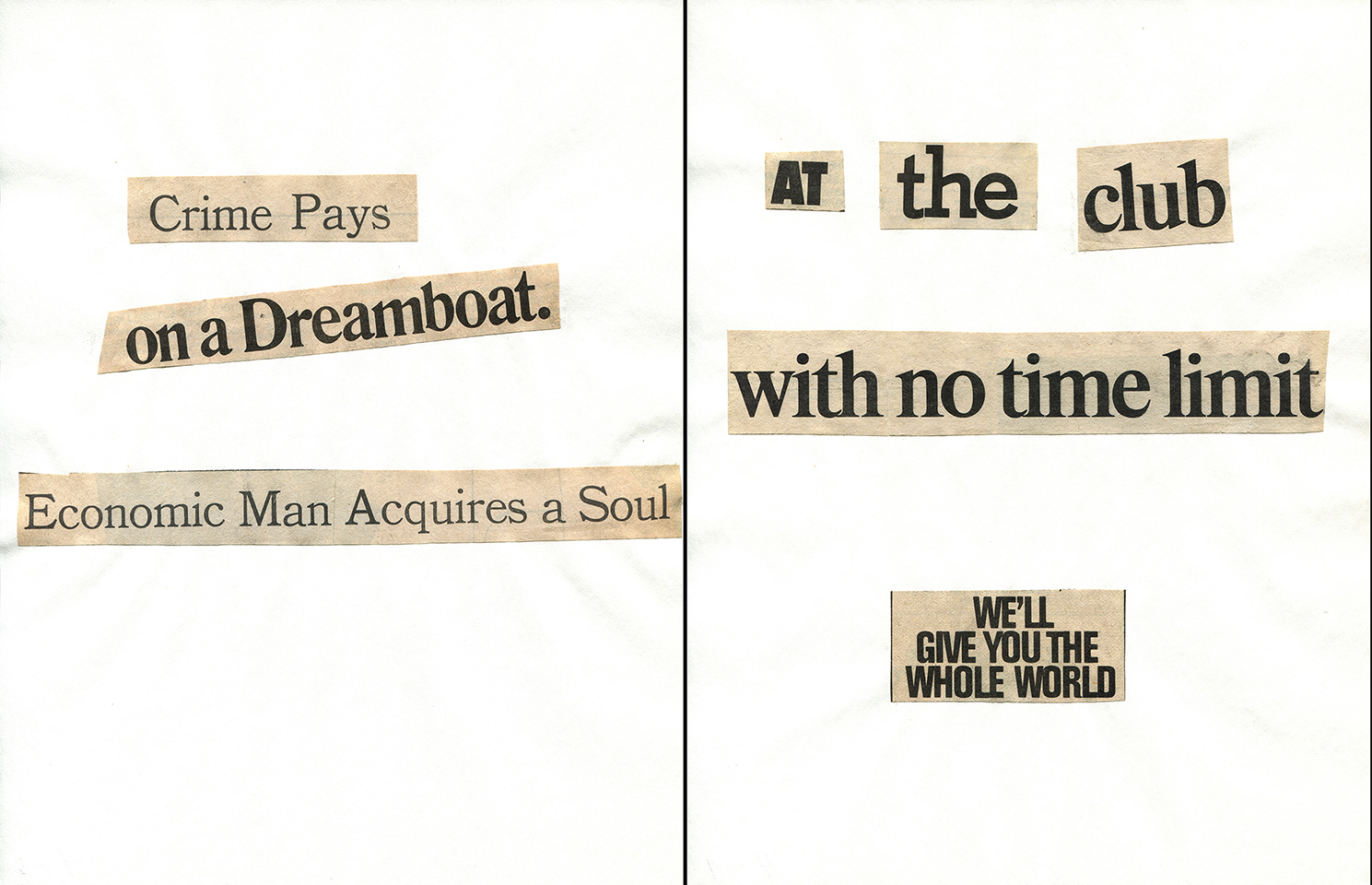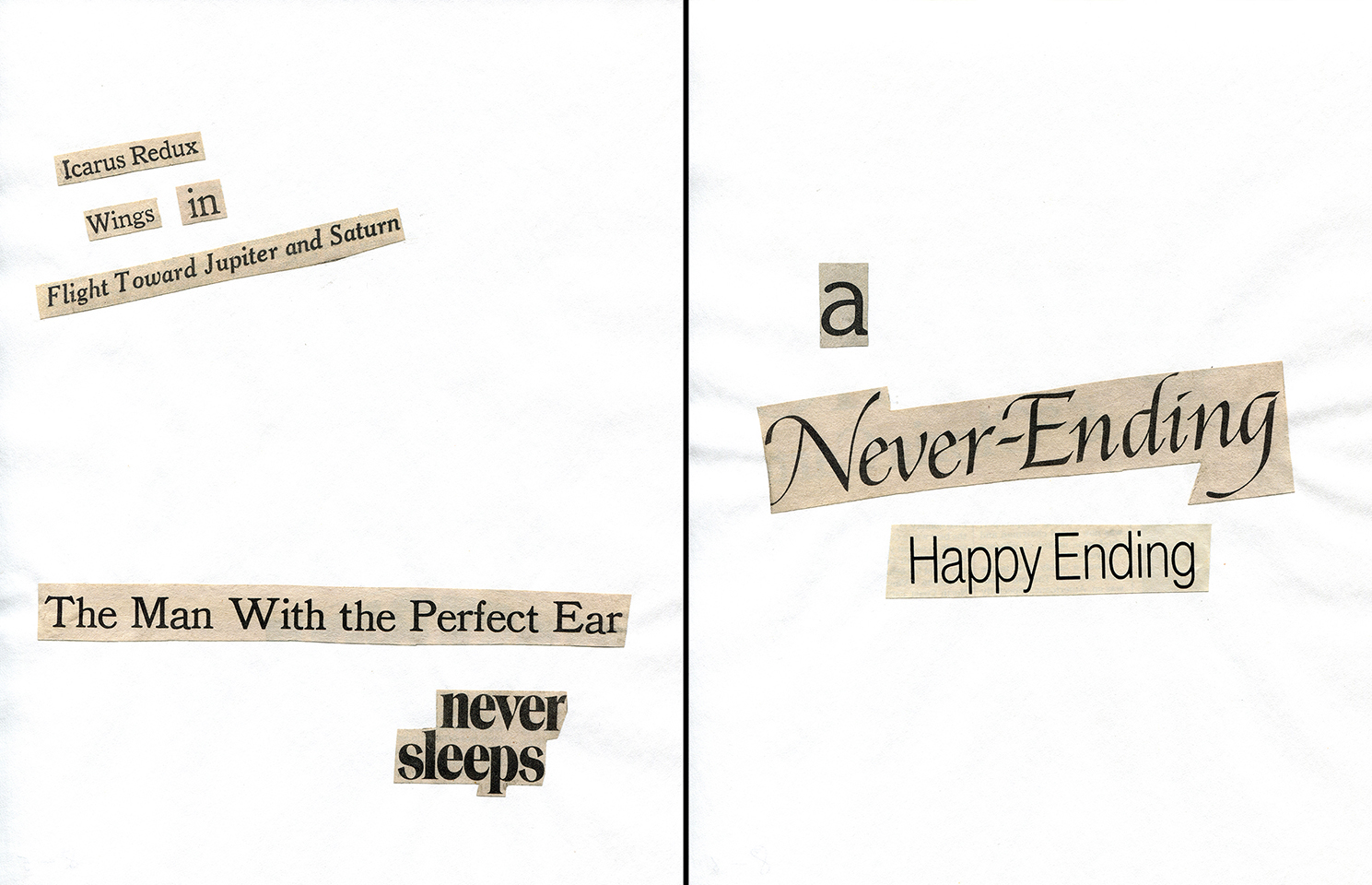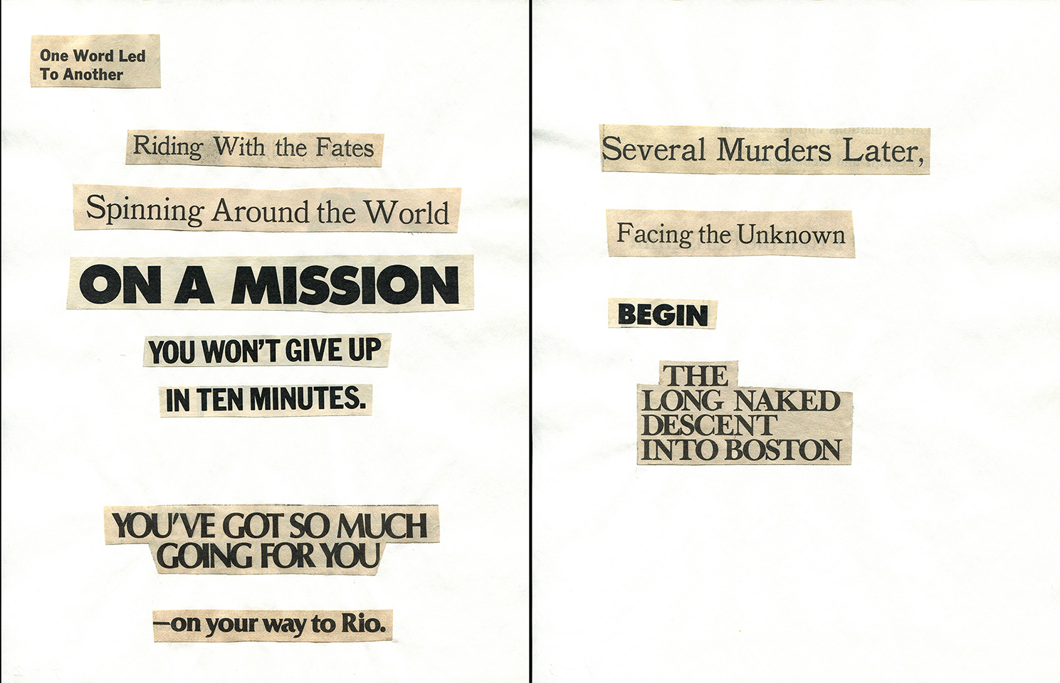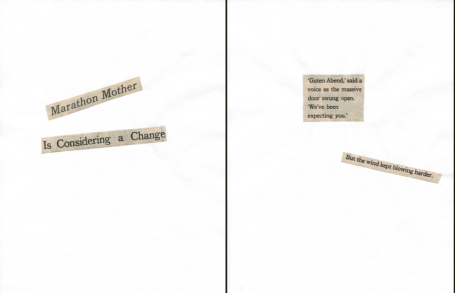 - Haiku Diptych 20. Studio sketch. Two panels selected from Cutting Out the New York Times (CONYT), 1977, as model for new diptych in Cutting Out CONYT, 1977/2017. Original newsprint cut-outs collaged on rag bond paper, each panel 8.5w x 11h (in). Sketch courtesy Lorraine O’Grady Studio.
