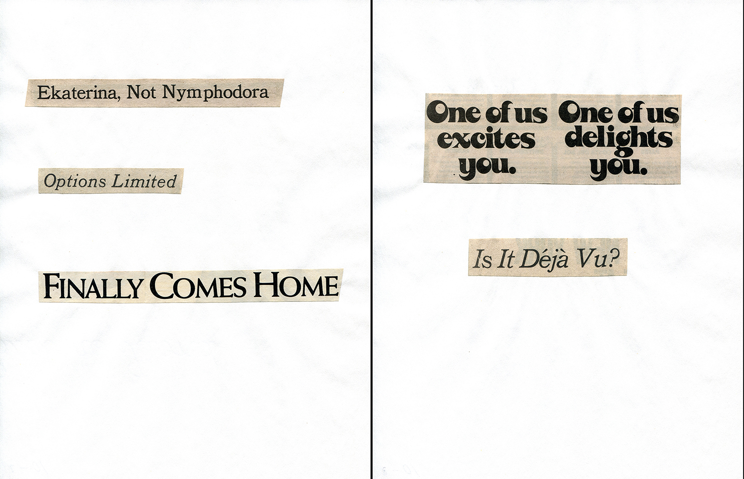 - Haiku Diptych 10. Studio sketch. Two panels selected from Cutting Out the New York Times (CONYT), 1977, as model for new diptych in Cutting Out CONYT, 1977/2017. Original newsprint cut-outs collaged on rag bond paper, each panel 8.5w x 11h (in). Sketch courtesy Lorraine O’Grady Studio.