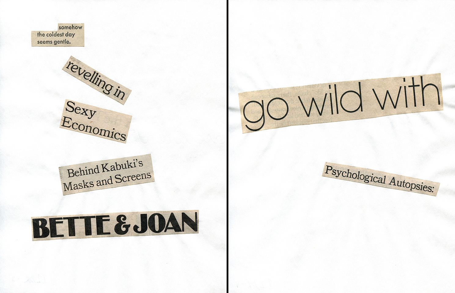 - Haiku Diptych 6. Studio sketch. Two panels selected from Cutting Out the New York Times (CONYT), 1977, as model for new diptych in Cutting Out CONYT, 1977/2017. Original newsprint cut-outs collaged on rag bond paper, each panel 8.5w x 11h (in). Sketch courtesy Lorraine O’Grady Studio.