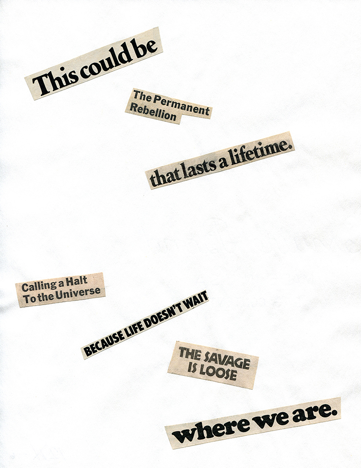 - Statement 26. Studio work scan of panel selected from Cutting Out the New York Times (CONYT), 1977, as model for Statement panel in Cutting Out CONYT, 1977/2017. Newsprint cut-outs collaged on rag bond paper, 8.5w x 11h (in). Work scan courtesy Lorraine O’Grady Studio.