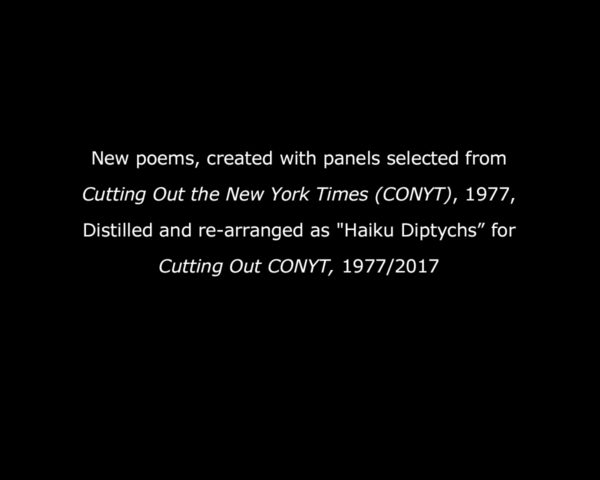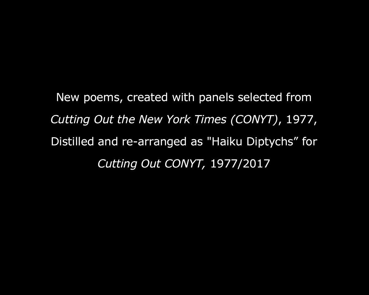 - Haiku Diptych 24. Studio sketch. Two panels selected from Cutting Out the New York Times (CONYT), 1977, as model for new diptych in Cutting Out CONYT, 1977/2017. Original newsprint cut-outs collaged on rag bond paper, each panel 8.5w x 11h (in). Sketch courtesy Lorraine O’Grady Studio.